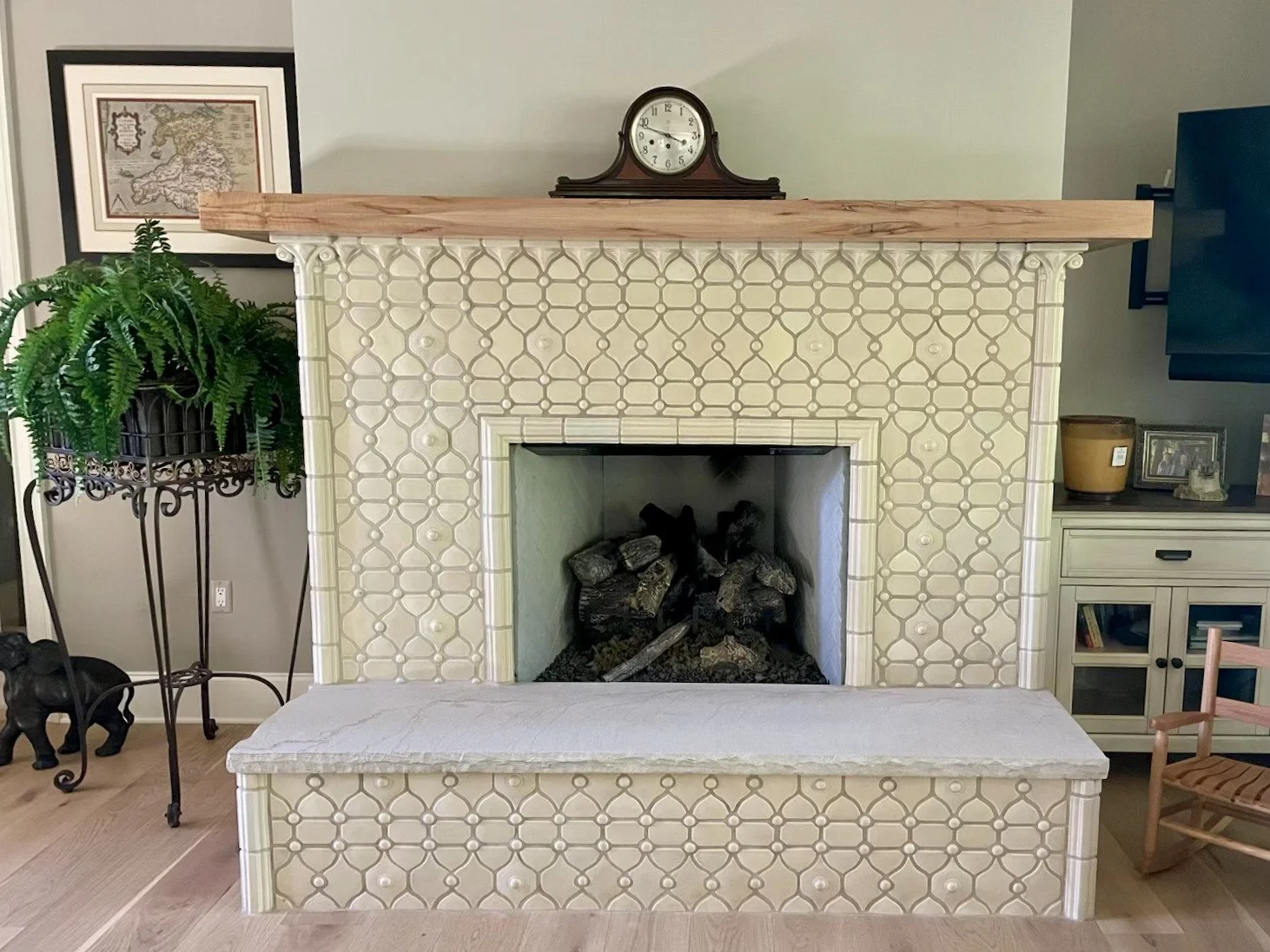 Explore how this stunning fireplace surround and hearth are elevated with handcrafted, cream-colored ceramic tile featuring an intricate, repeating geometric pattern. The raised-relief texture of the artisan tile adds depth and a sense of timeless elegance, perfectly complementing the traditional yet classic design of the living space. Discover the charm of using geometric and Craftsman-style tiles to create a durable, beautiful, and heat-resistant focal point in your own home. This project showcases the transformative power of quality, artisan ceramic tiles on both the fireplace face and hearth.